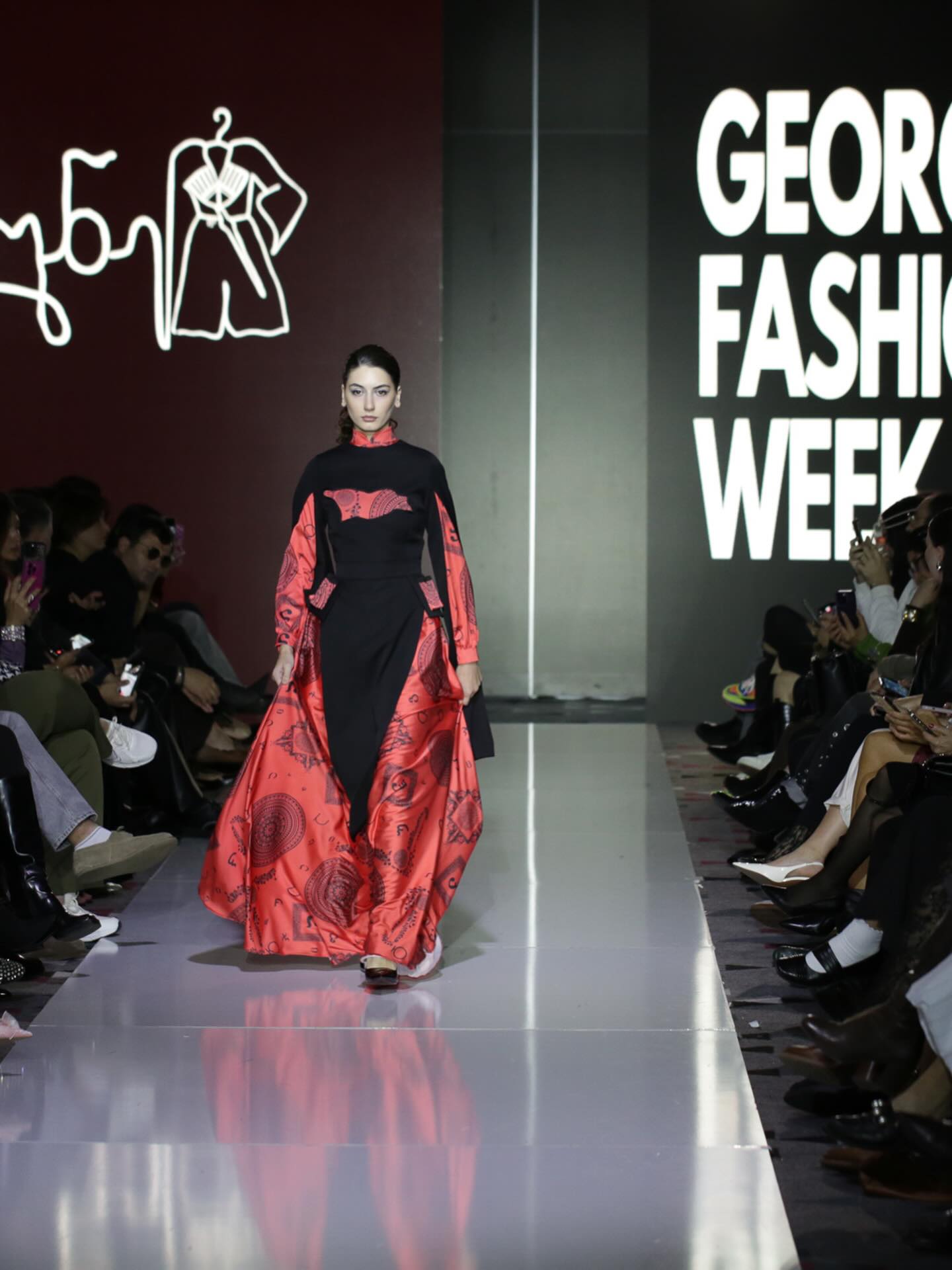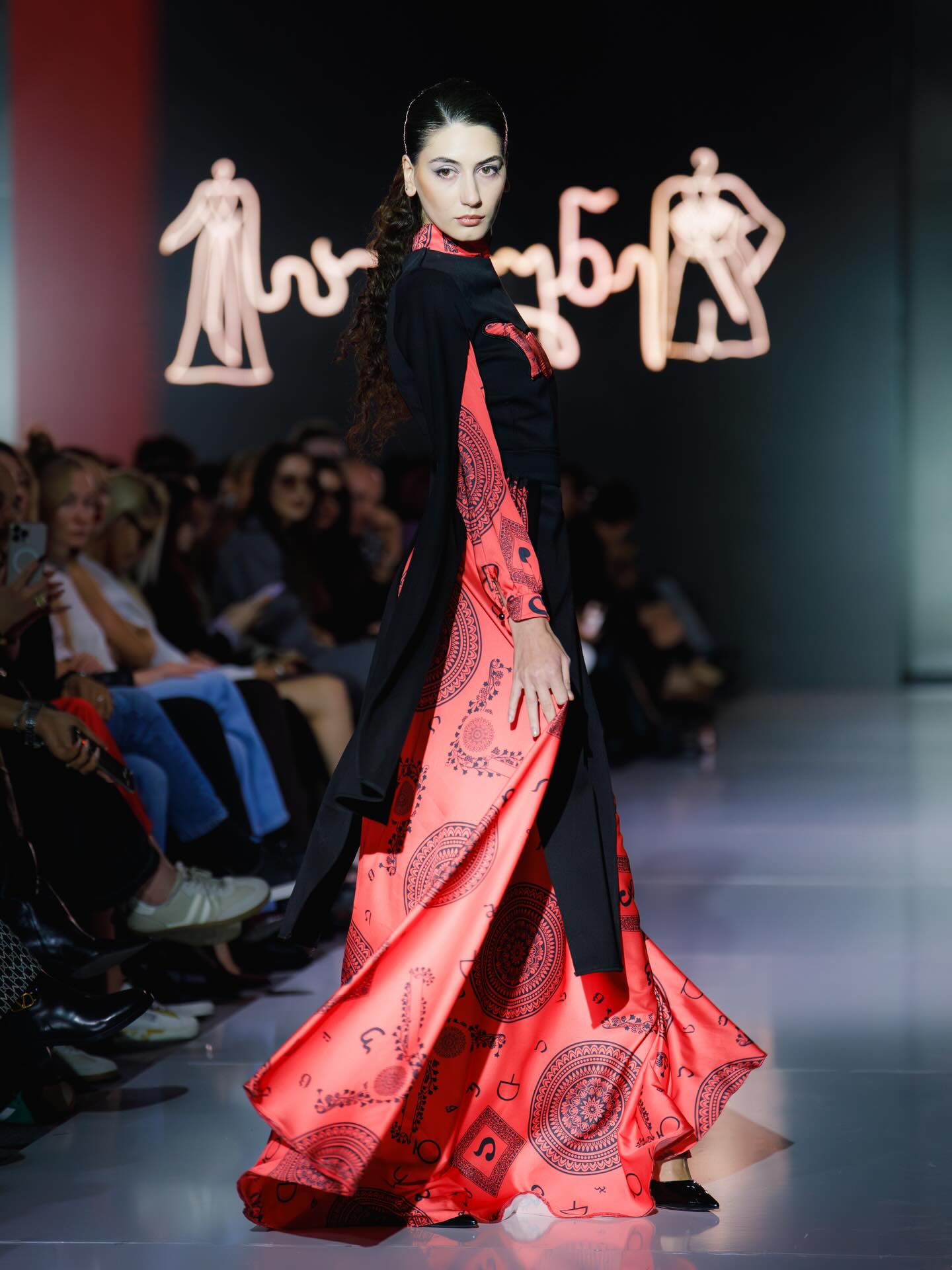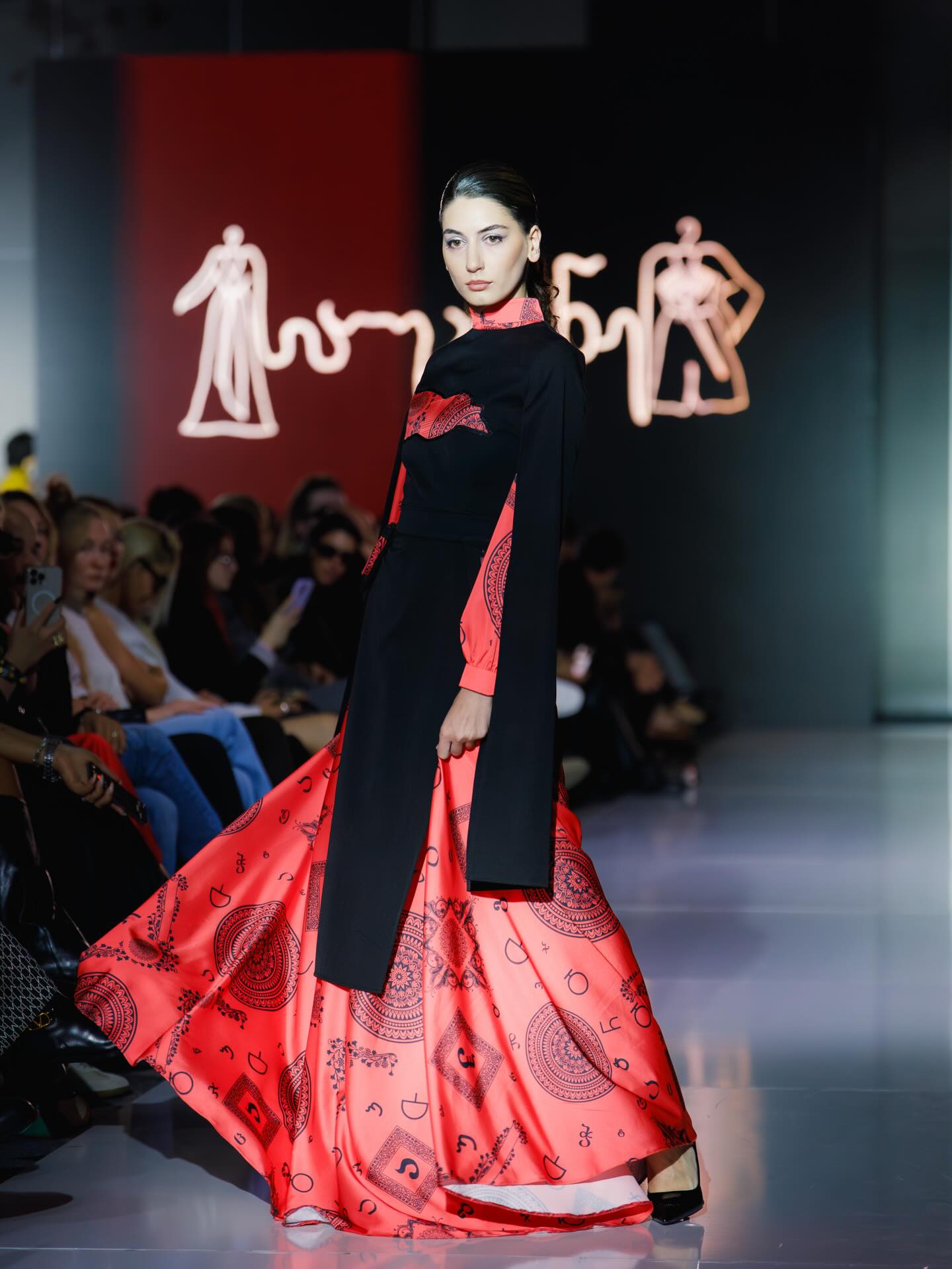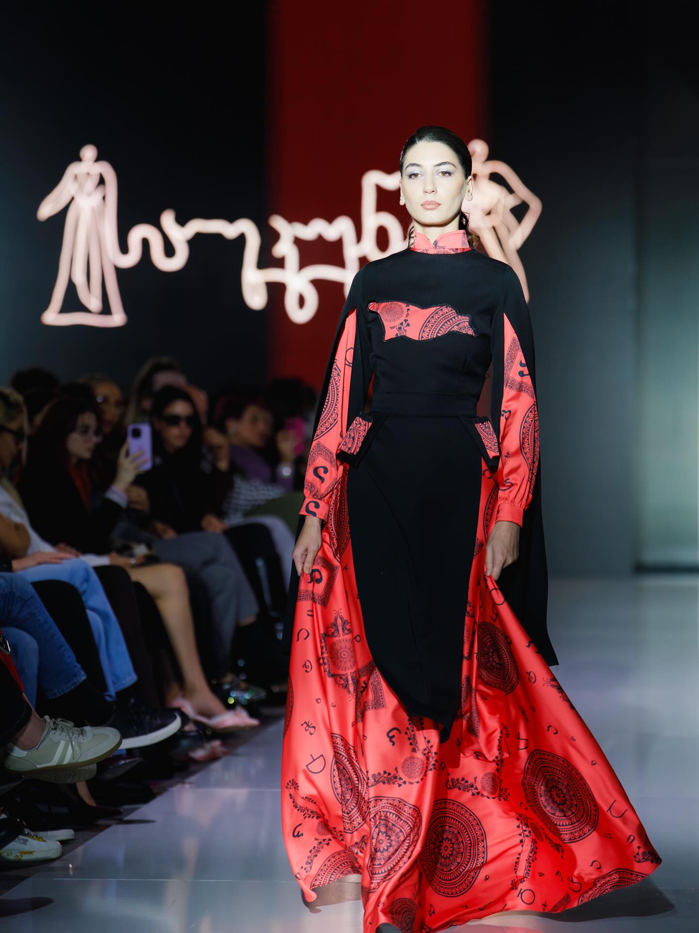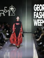 ეს დახვეწილი აბრეშუმის კაბა და ქართული ორნამენტებით გაფორმებული გადასაცმელი აერთიანებს საუკუნეების კულტურას და თანამედროვე ელეგანტურობას.