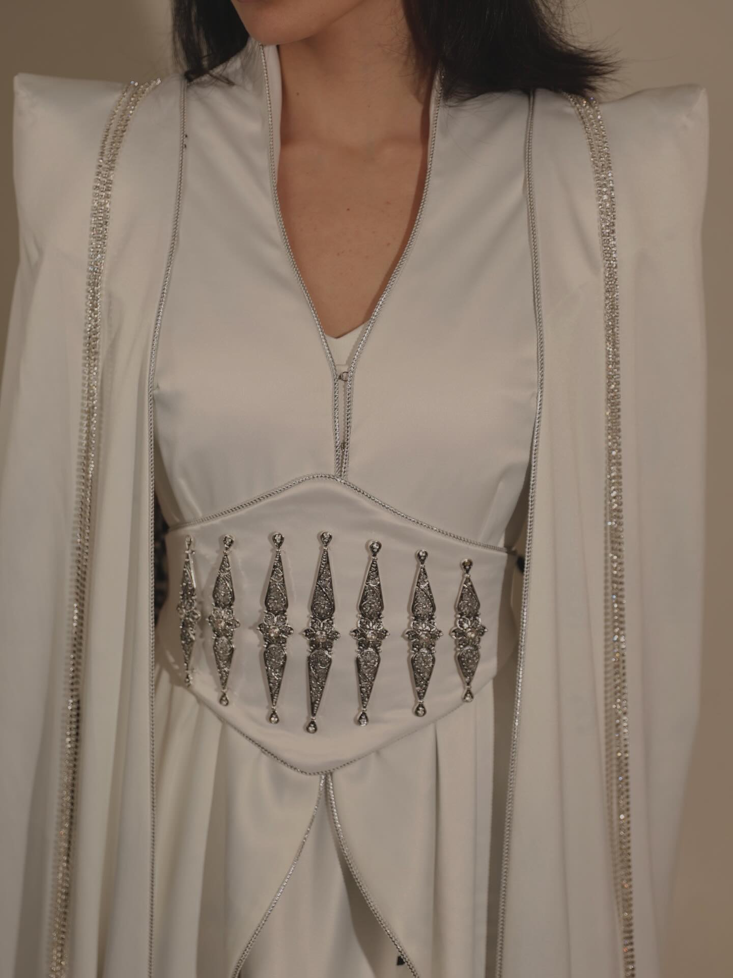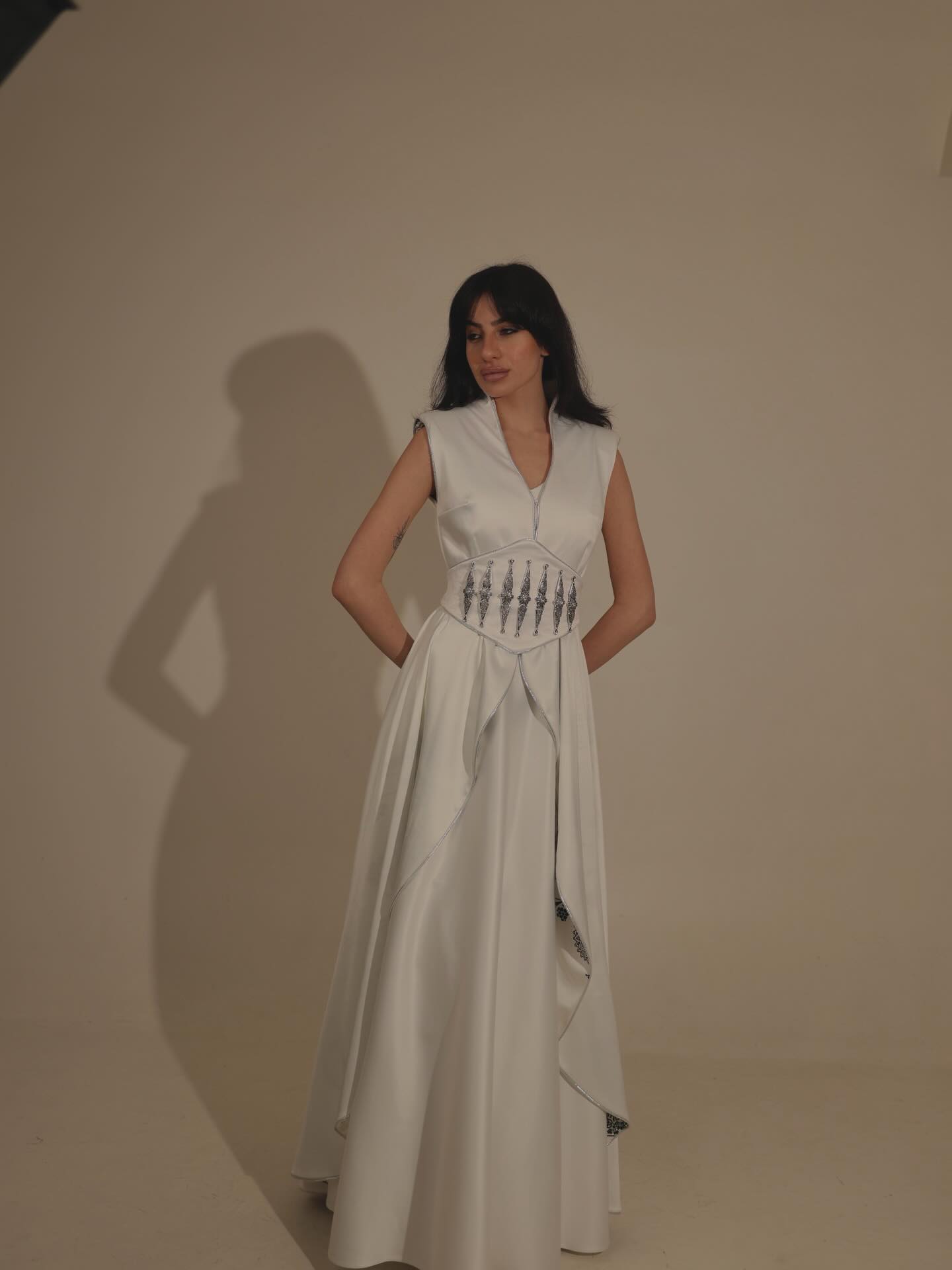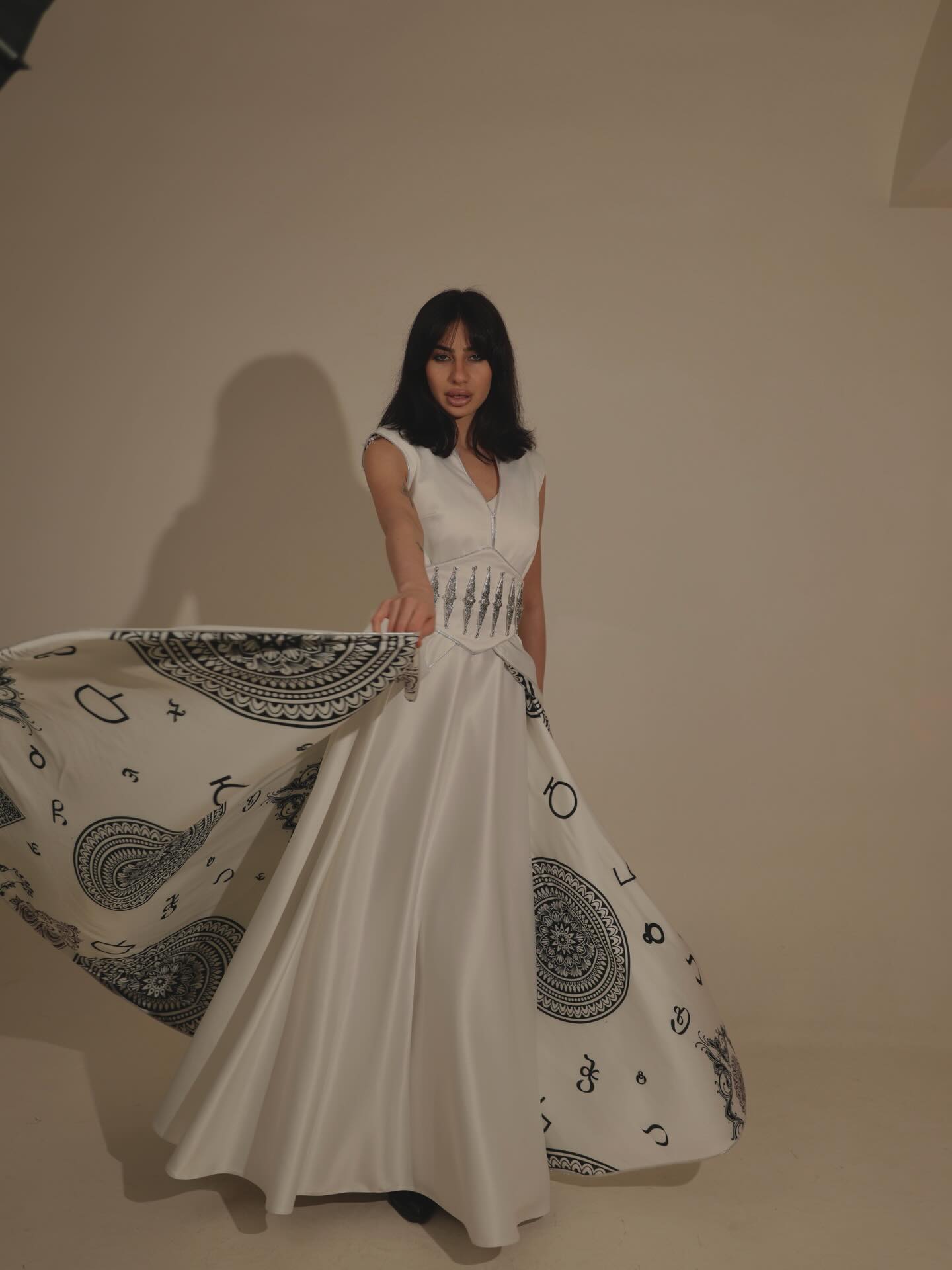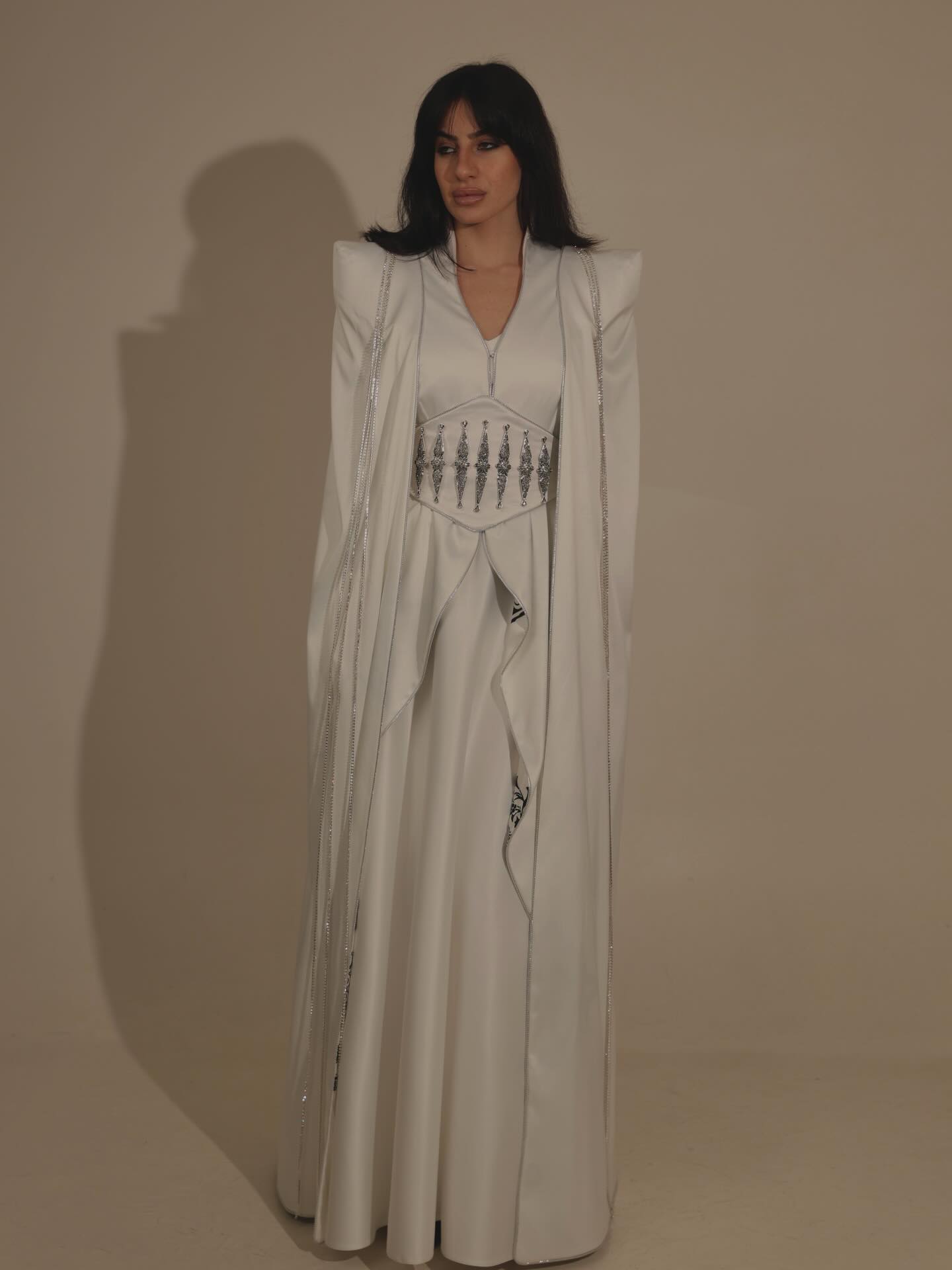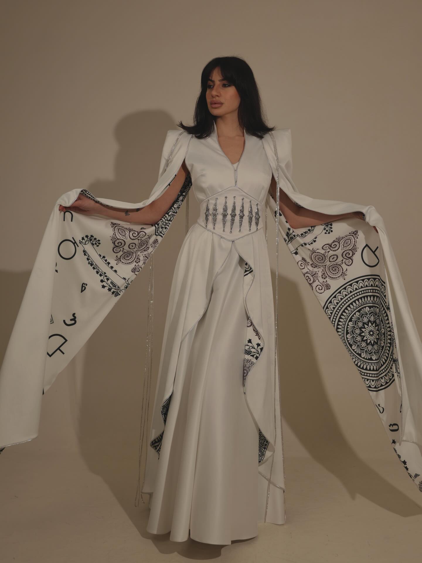 ნიუ საუკუნე წარმოგიდგენთ ახალი კოლექციიდან, სახელწოდებით „დიდებული“, საქორწილო კომპლექტს — ხელით შექმნილ მოსასხამსა და კაბას, რომელიც აერთიანებს ქართული ტრადიციის სიღრმესა და თანამედროვე დიზაინის დახვეწილ ესთეტიკას.