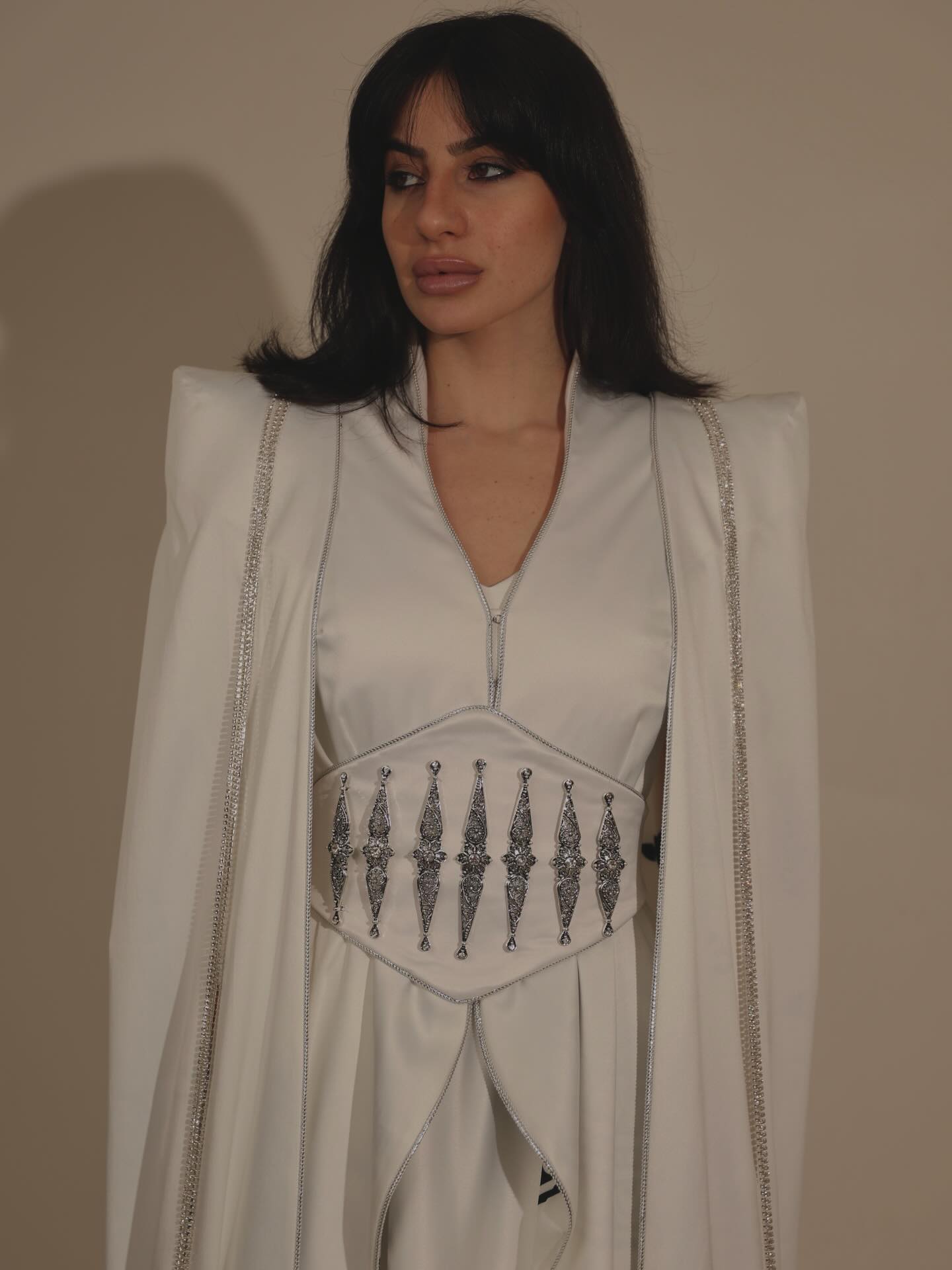 ფასში შედის: მოსასხამი, კაბა, ქამარი და დეკორატიული მხრები